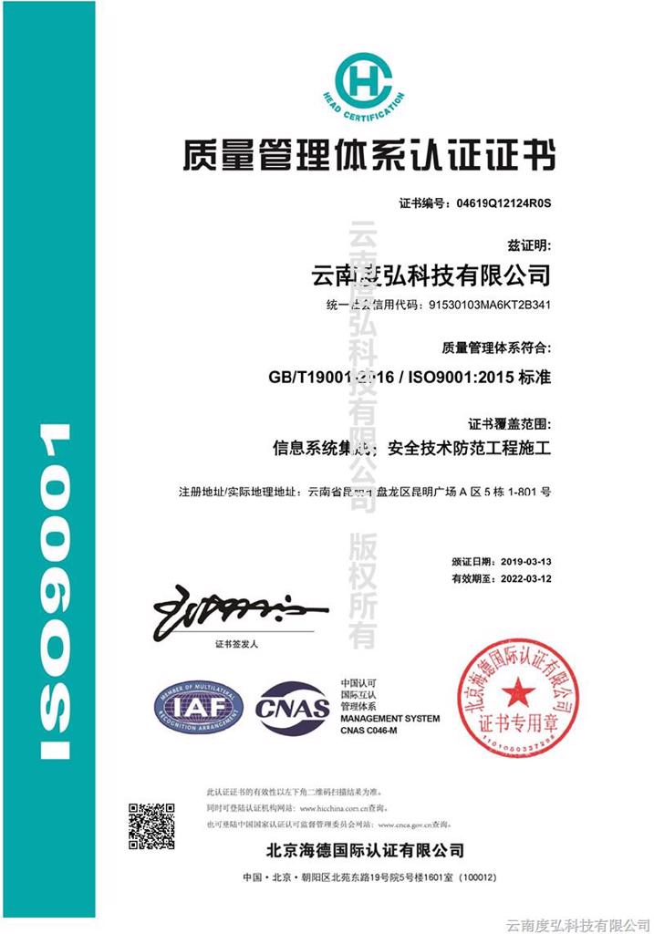 公司已经取得ISO9001质量管理体系、ISO45001职业健康管理体系、ISO14001环境管理体系认证资质、3A企业资信、高新技术企业、安防资质