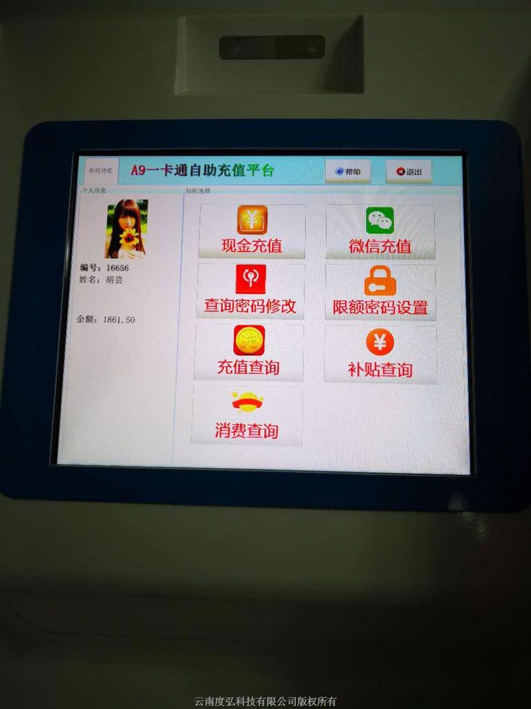 自助服务,功能全面。可进行现金、微信充值、充值查询、消费查询、补贴查询,支持用户挂式、修改密码等功能。